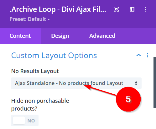 5.) In the Custom Layout Options assign a "No Results Layout" (make one in the Divi LIbrary - add a Section, Row and Text Module with some simple text.)