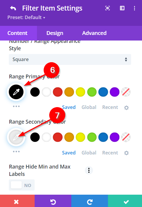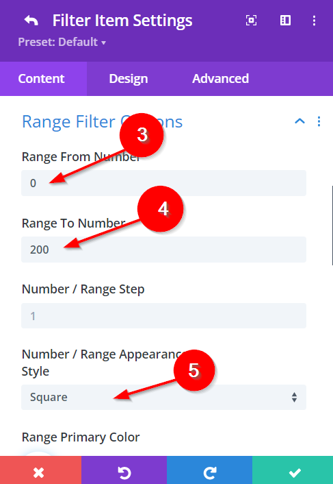 5.) In the Range Filter Options set the Number/Range Appearance Style to "Square."