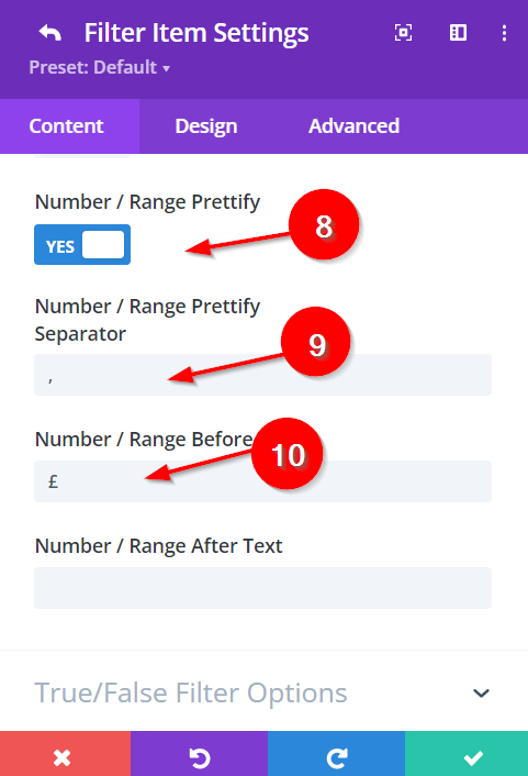 10.) In the Range Filter Options add a currency symbol (or another character) into the "Number/Range Before" field