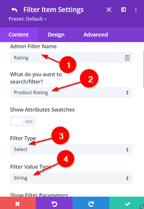 Customize the Main Options in the Content Tab of the Ratings Filter Item. Below are the important settings to follow to get the style of the Ratings Filter in the Ajax Filter Demo page shown at the beginning of this tutorial. For more information on this module, please visit our documentation to your left.