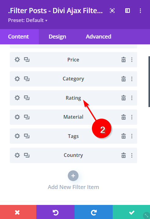 Inside the Filter Post Module, you will see the ability to add a new Filter Item. Add one and name it "Rating" in the Admin Filter Name field.
