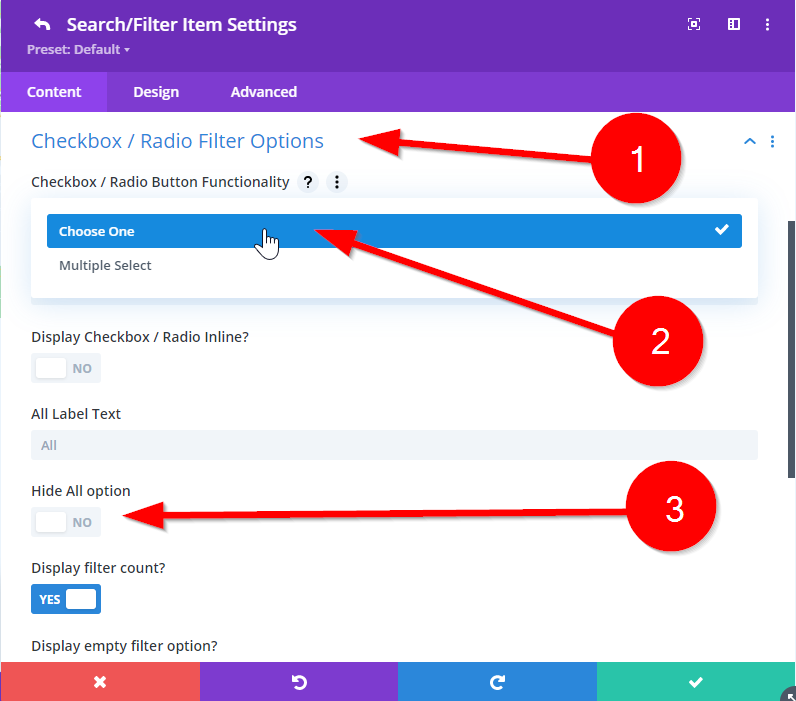 The next step is to head down to the Checkbox / Radio Filter Options tab and select Choose One from the Functionality dropdown. If you want to hide all then enable the High All Option.