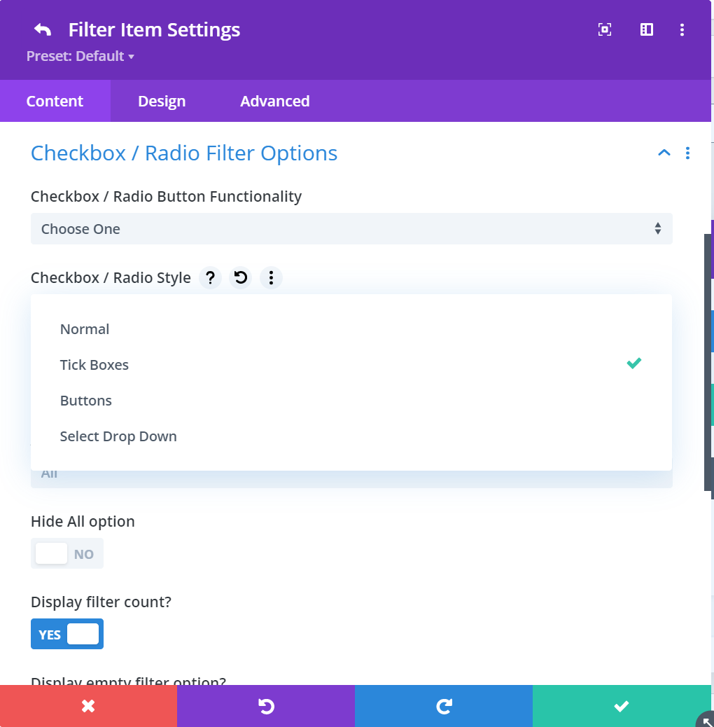 To change the appearance, go to Content > Checkbox / Radio Filter Options > Checkbox / Radio Style.