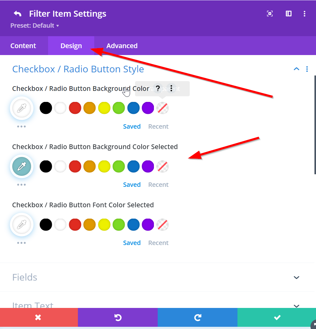 To change the colour, go to Design > Checkbox / Radio Button Style.