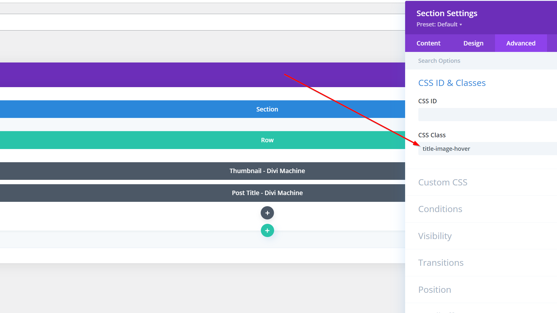 Create a Custom Loop Layout in the Divi Library adding the Thumbnail and Post Title modules. Then add a CSS class name to the Divi Section. In this example, I add the CSS class "title-image-hover" to the Divi Section.