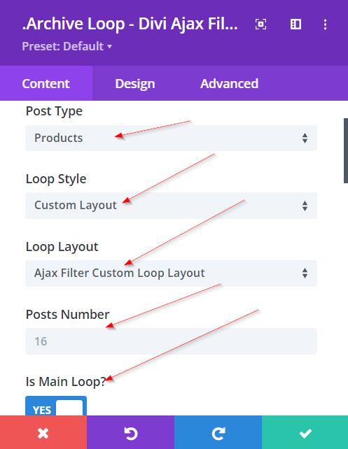 Inside the content module options, you will need to set the Post Type (Products, Pages, Posts, etc.) to display in the loop, the Loop Style as either Custom Layout or Default. If you select Custom Layout then you will need to select a Custom Loop Layout built in the Divi Library. After this, select the Posts Number and enable the Is Main Loop button.