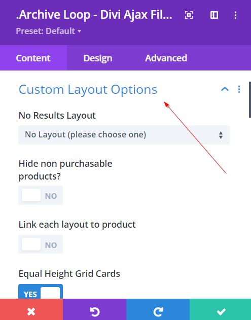 If you select the Custom Loop Layout then you will be able to select the No Result Layout (made in the Divi Library the same way as the actual loop). In this section, you can select if you want to link each layout to the product. Along with this, you can set the size of the cards and the layout as Grid, List or Masonry.