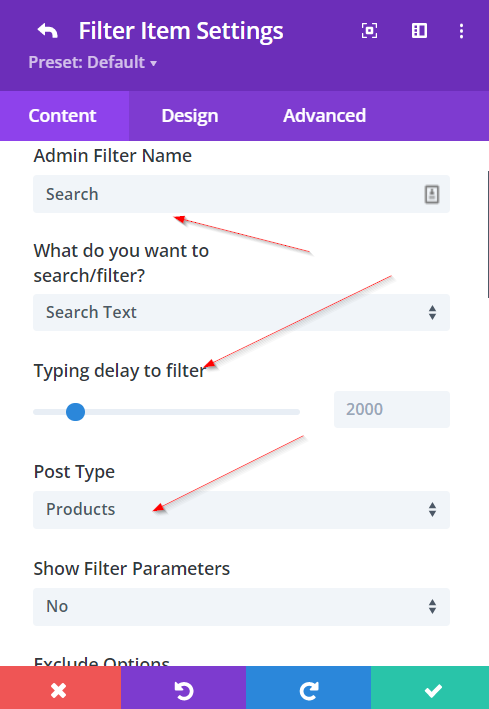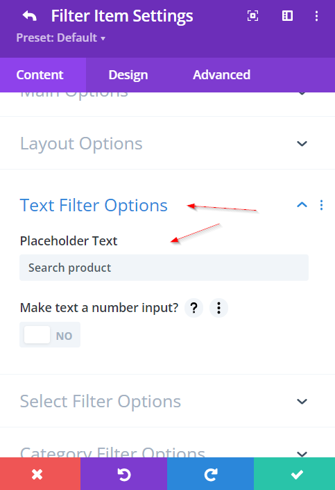 If you would like to define the Placeholder Text of the search field you can do so in the Text Filter Options section.