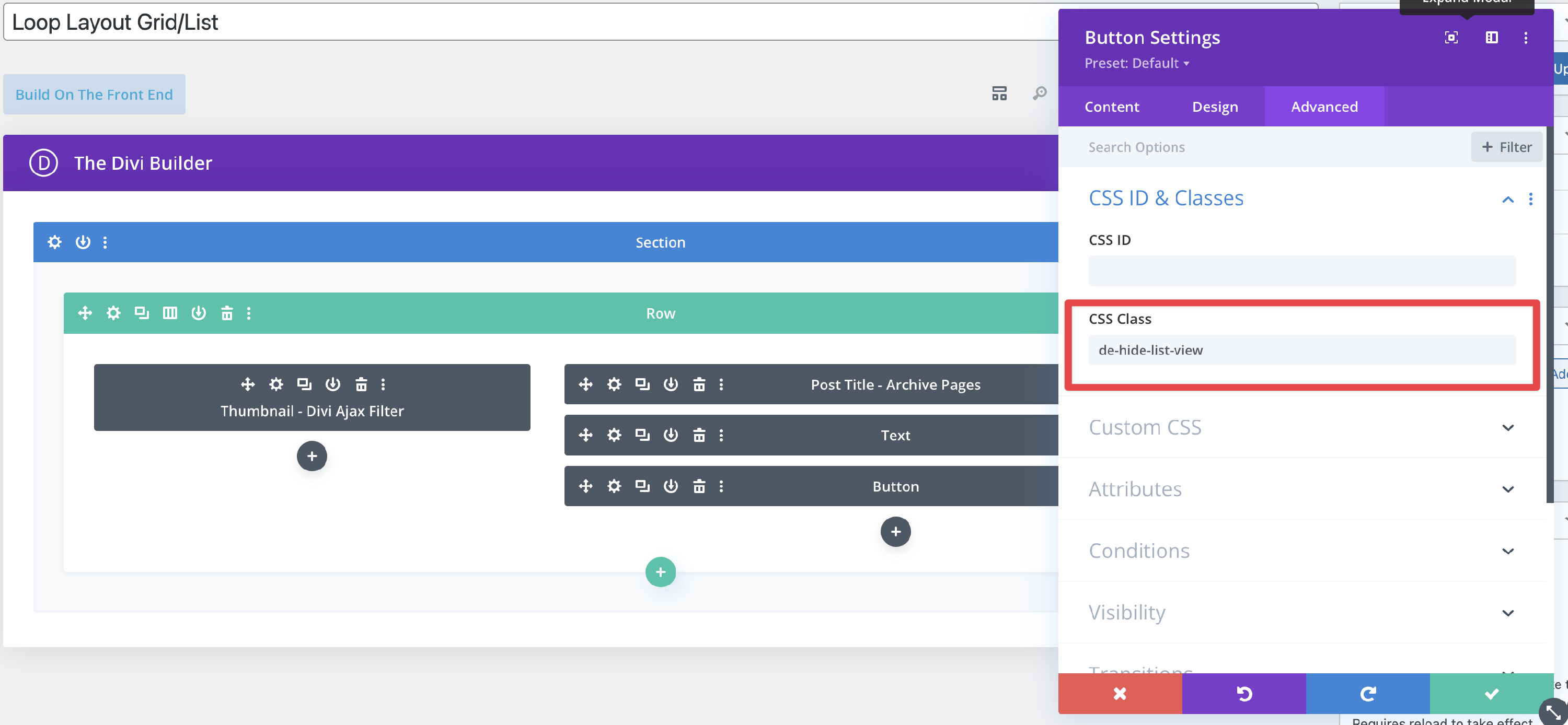 .de-hide-grid-view: Use this to hide a specific element like a button for example in grid view. This should be added as a Custom Class in the Advanced tab of the element you want to hide in the view.