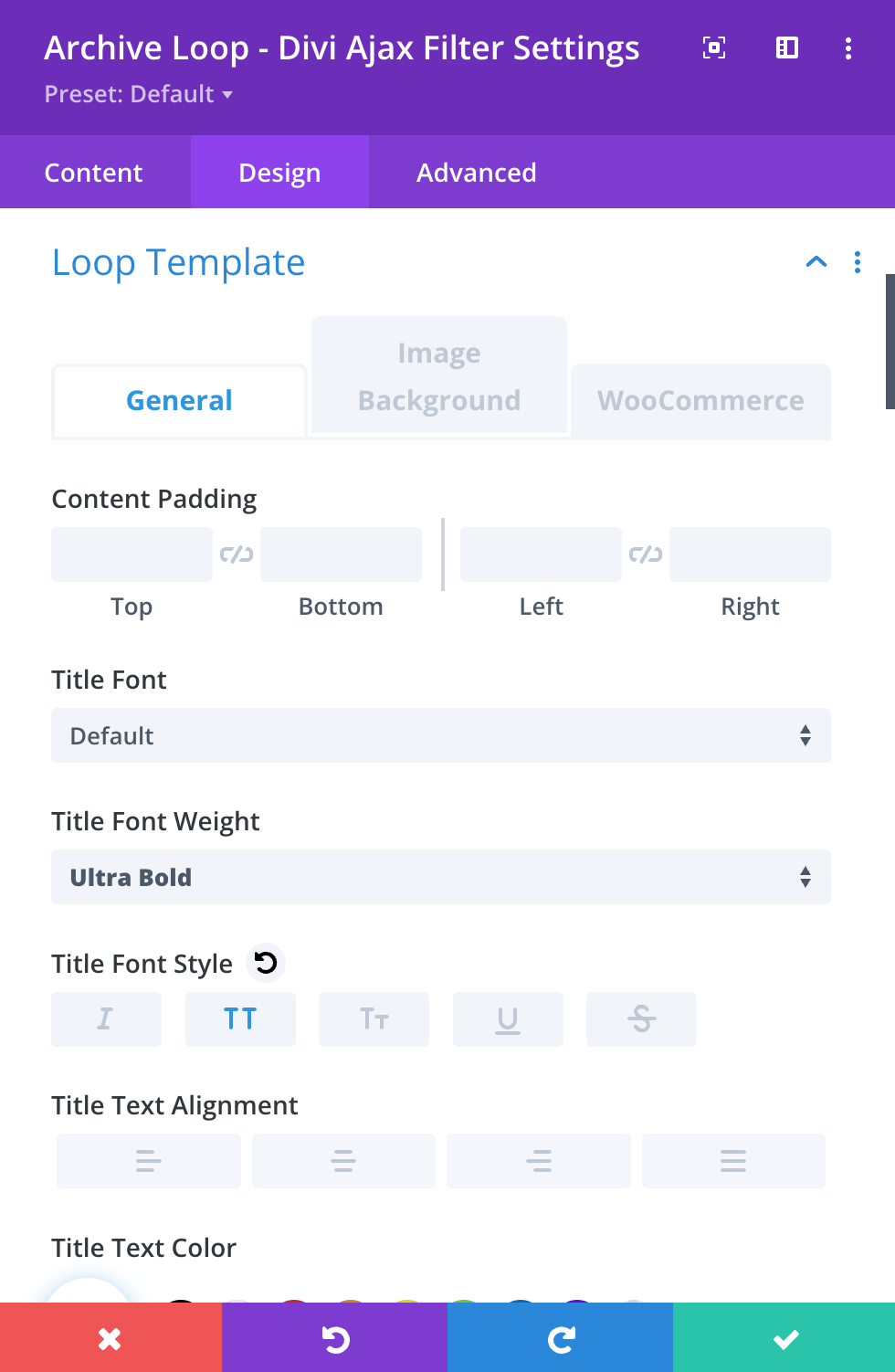 5. Design Settings: Head over to the design tab and open the Loop Template settings. Customize the design elements such as font boldness, text colors, metadata, excerpt, and other specific settings based on the selected loop template. You will find a tab that corresponds with your selected Loop Template at the top.