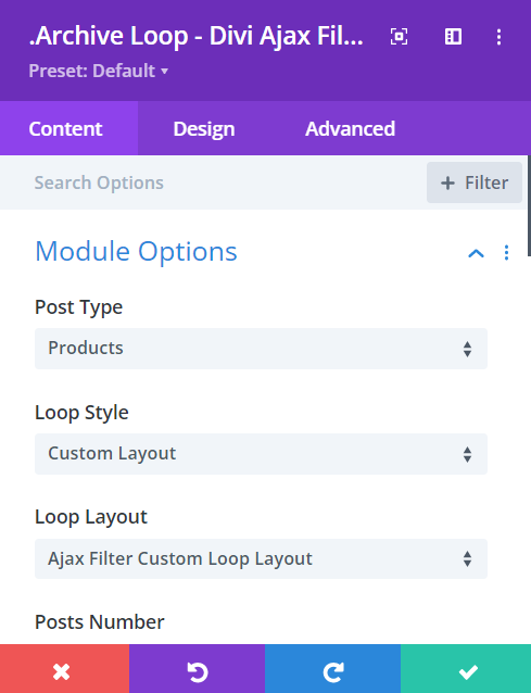 The Archive Loop Module allows you to display your Products or Posts. Typically it will be used on Archive, Category and General WordPress Pages alongside the Filter Posts Module. Do NOT use it in the Custom Loop Layout.