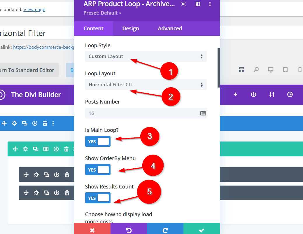 1.) Select Custom Layout as Loop Style. 2.) Select the Custom Loop Layout that you have already made. 3.) Enable the Is Main Loop feature. 4.) Enable the Show Orderby Menu feature. 5.) Enable the Show Results Count feature.