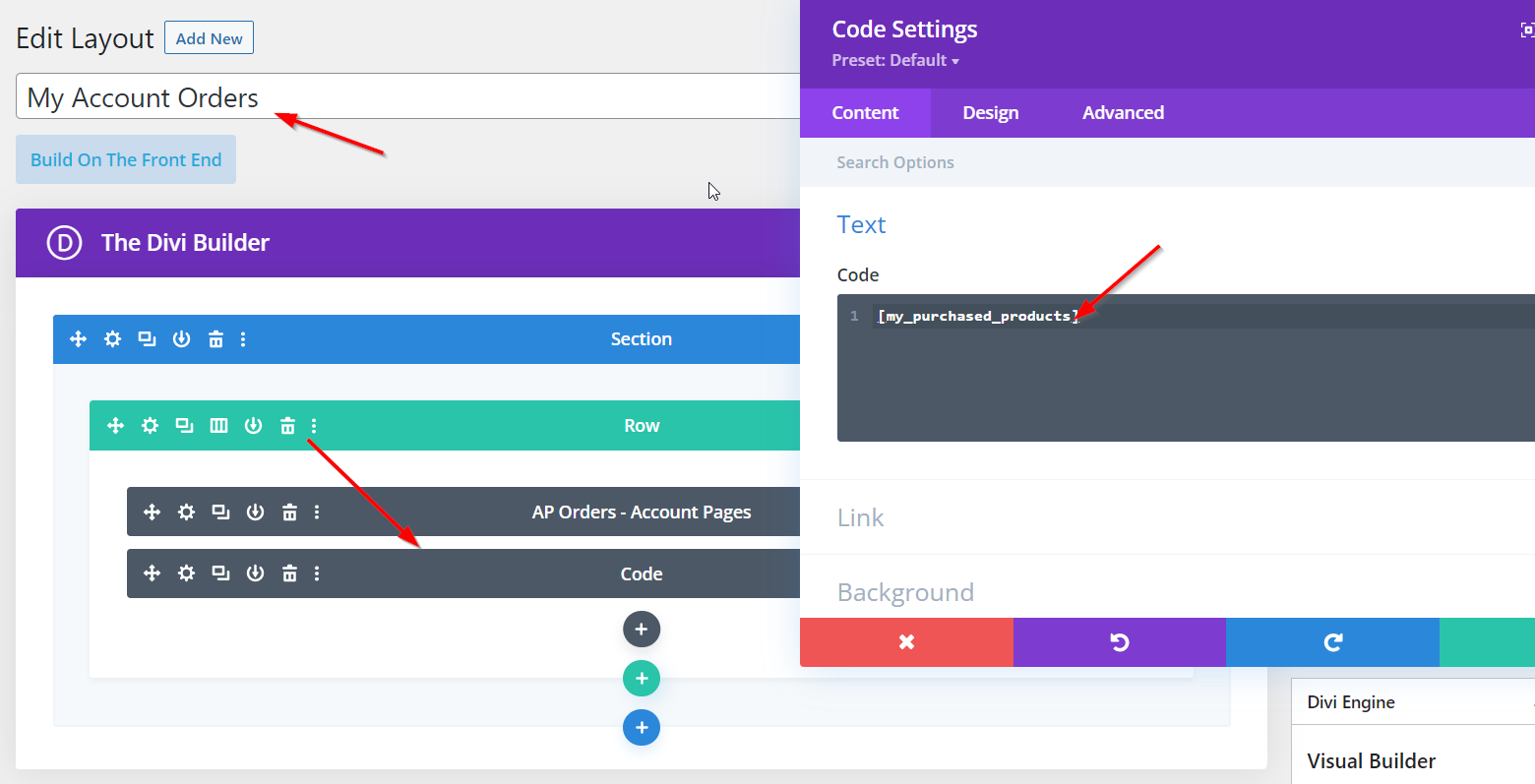 Add the shortcode [my_purchased_products] to the Code module of your Orders Layout.