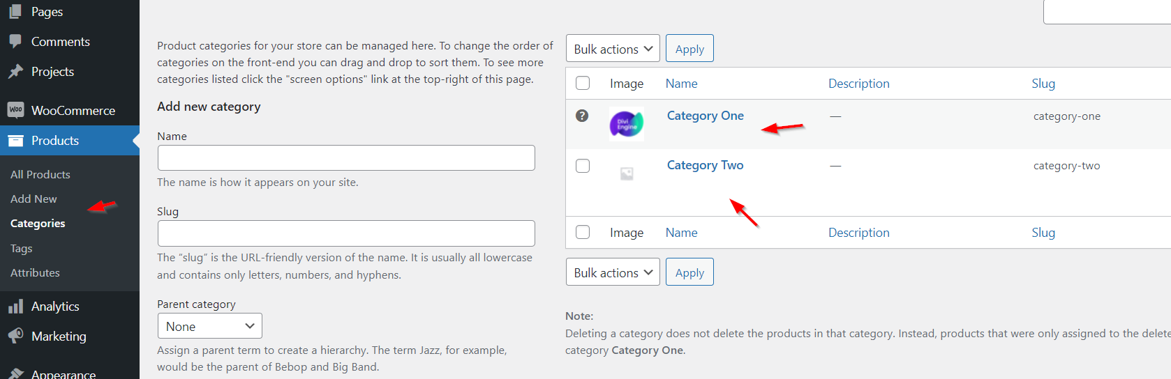 Head over to WooCommerce and create your categories, tags, attributes or ratings before assigning products. In this example, I have created categories.