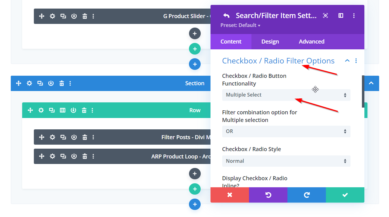 If you would like one Filter Item with Checkbox/Radio Buttons to have the multiple select features then select Multiple Select from the Checkbox/Radio Filter Options section of the Filter Item.