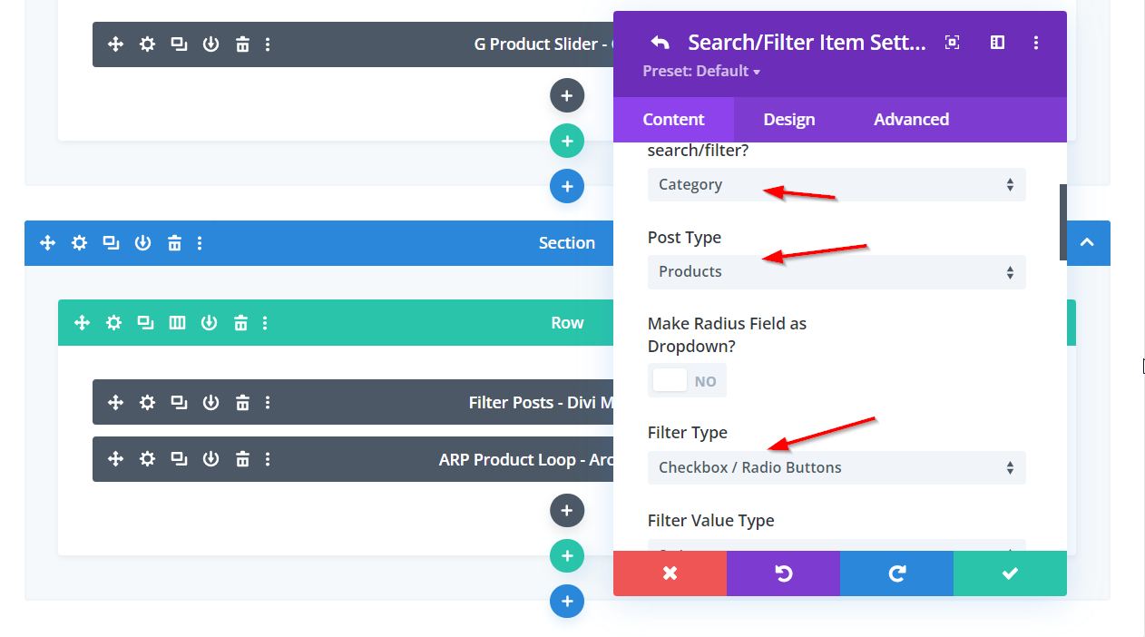 Add and define your Filter Items. The more Filter Items that you add the more options your user will have to select. Please know that while you could try the Select Filter Type, if you would like your user to select multiple options for one Filter Item then go for the Checkbox/Radio Buttons.