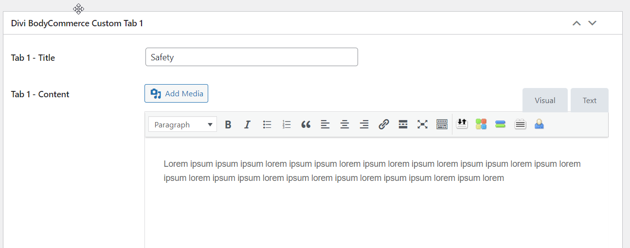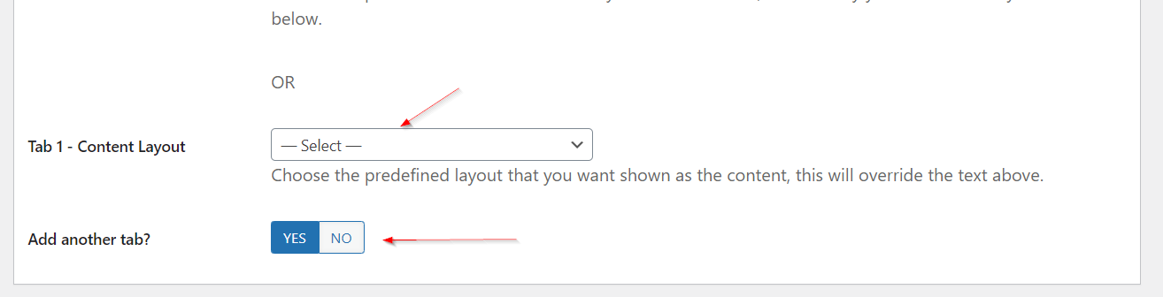 Make your way to your products and add tabs with content. To add a new tab please click the YES button for "Add Another Tab." If you would like to remove a tab, simply remove the title text and select NO. Lastly, if you wish to use a layout built in the Divi builder for the content of the tab then simply select the layout from the drop-down. Please note that to make your tab display there needs to be a Title. if there is no Title text then the tab will not be displayed in the .PP TABS module.