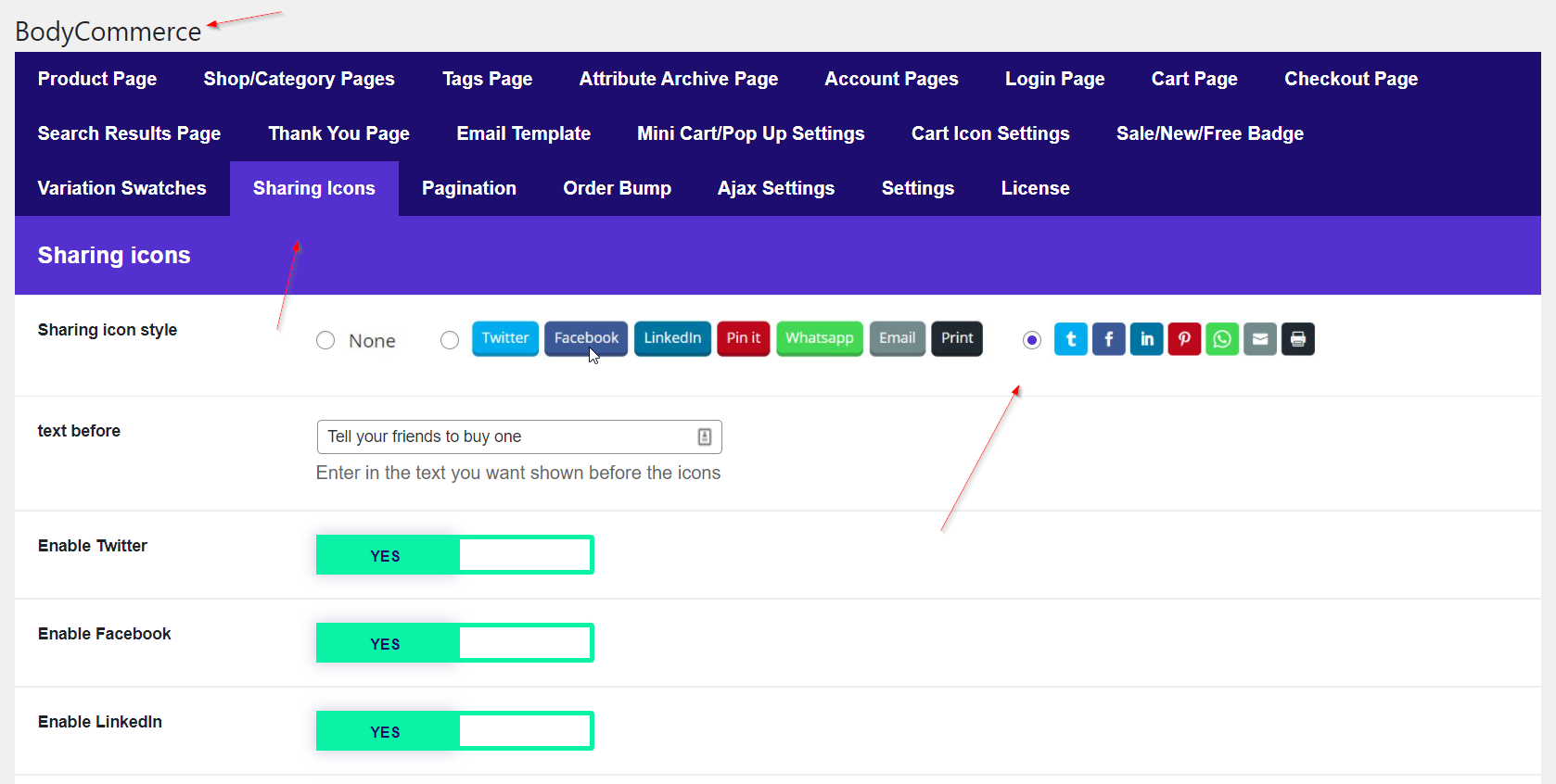 Turn on the icons by selecting an icon style and enabling your icons of choice (e.g. Twitter, Facebook, etc.) at BodyCommerc > Sharing Icons. Follow this with some additional settings.