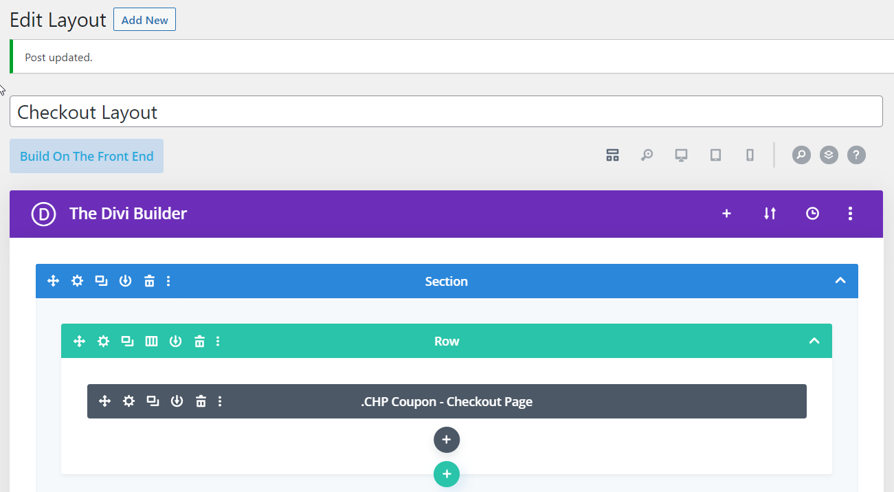 Head over to Divi > Library and create a checkout layout by adding CHP modules such as the CHP Coupon module.