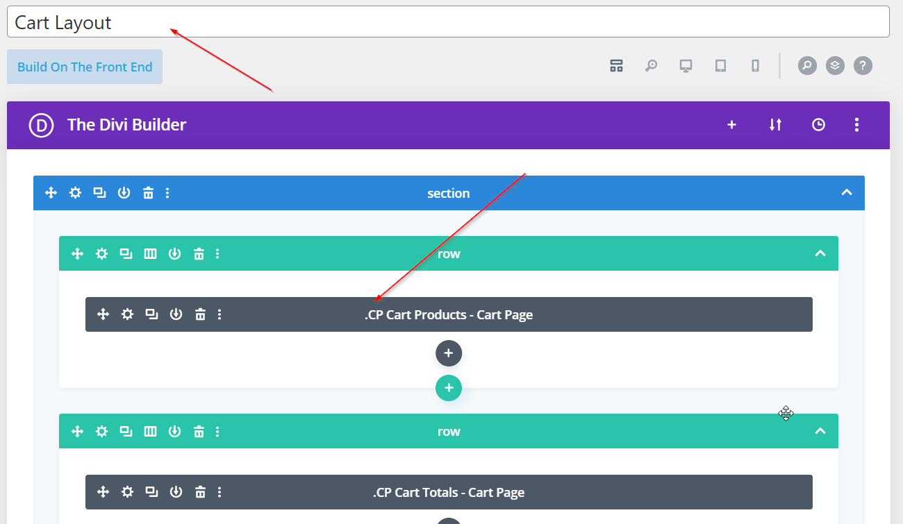 Head over to Divi > Library and create a cart page layout by adding CP modules such as the CP Cart Totals module.