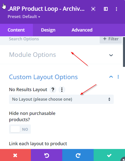 Add a "no results" layout to your setup by firstly creating a custom layout in the Divi Library containing an image, video, text, etc. After this is done, make your way to search results page and assign it to the ARP Product Loop module under the Custom Layout Options section.