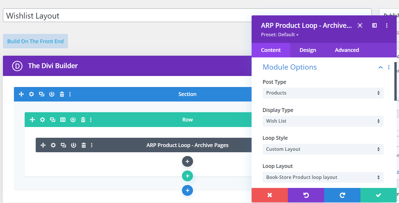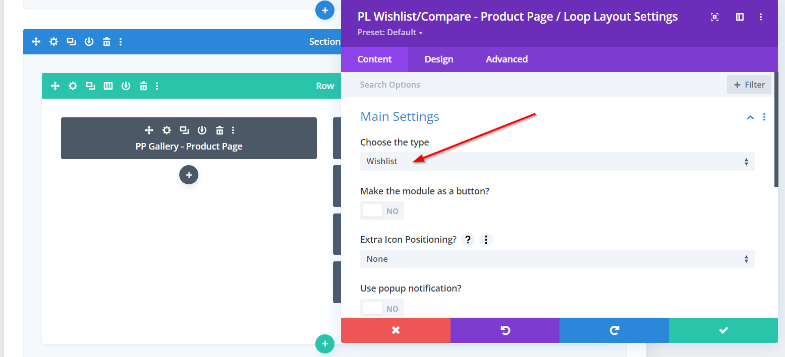 - Select a custom loop layout (aka product loop layout) built in the Divi Library. Note that you should add the Wishlist/Compare module to THIS product loop layout so that your customers can remove products from their wishlist.