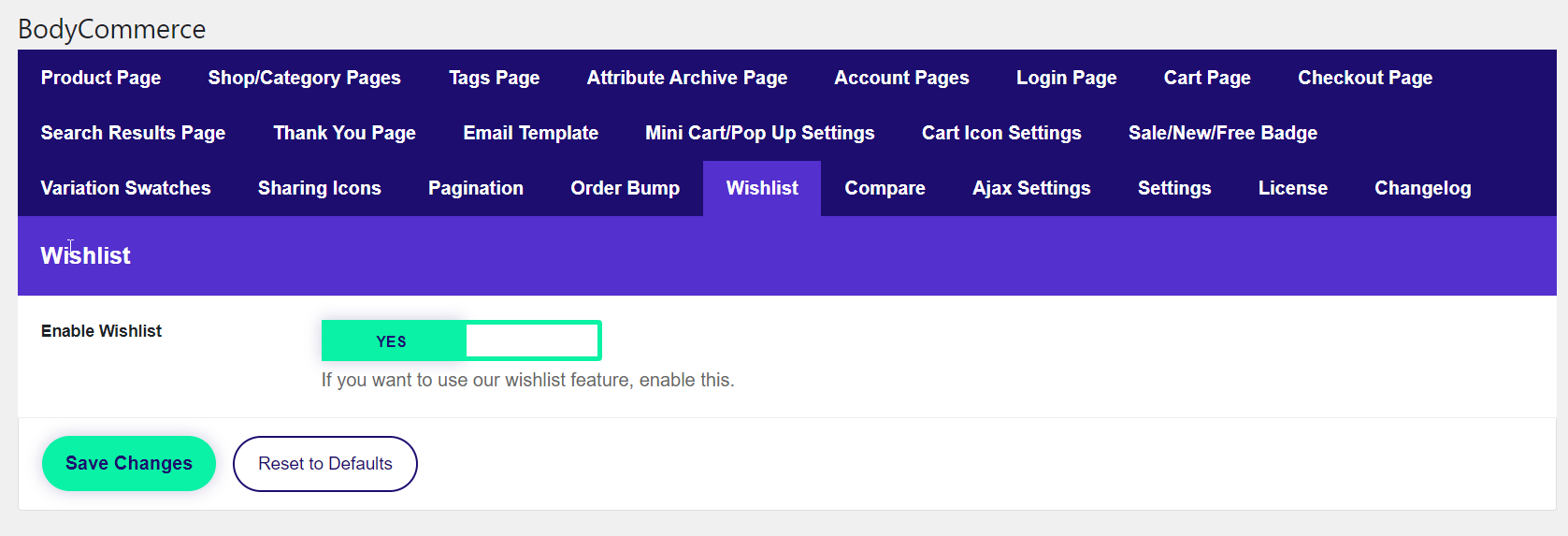 Go over to BodyCommerce > Accounts and select your Wishlist layout from the Wishlist dropdown. This will then add the Product Loop layout in the Wishlist layout to the account page so that users can view wished-for products.