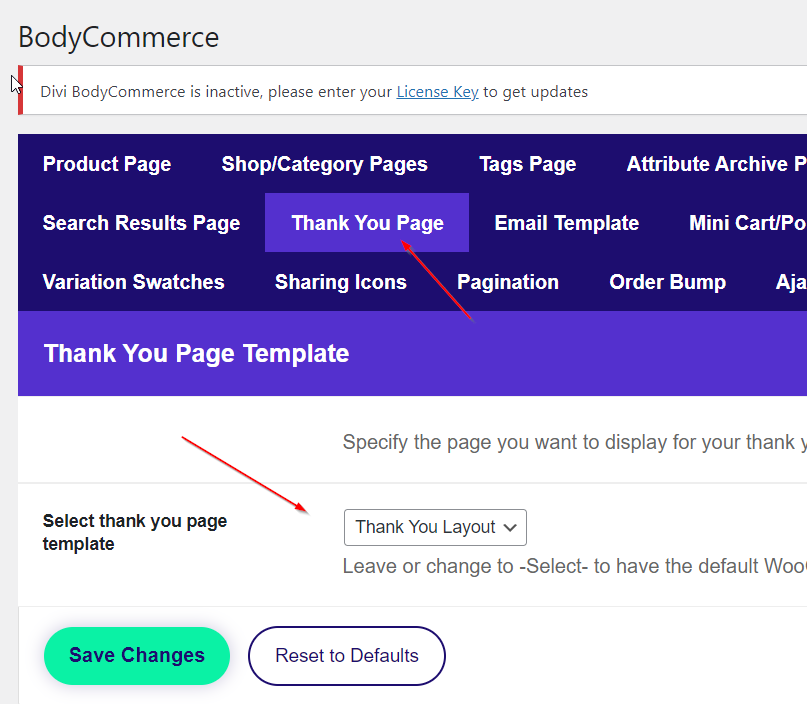 Go through to BodyCommerce > Thank You Page and assign this module in the Select thank you page template.