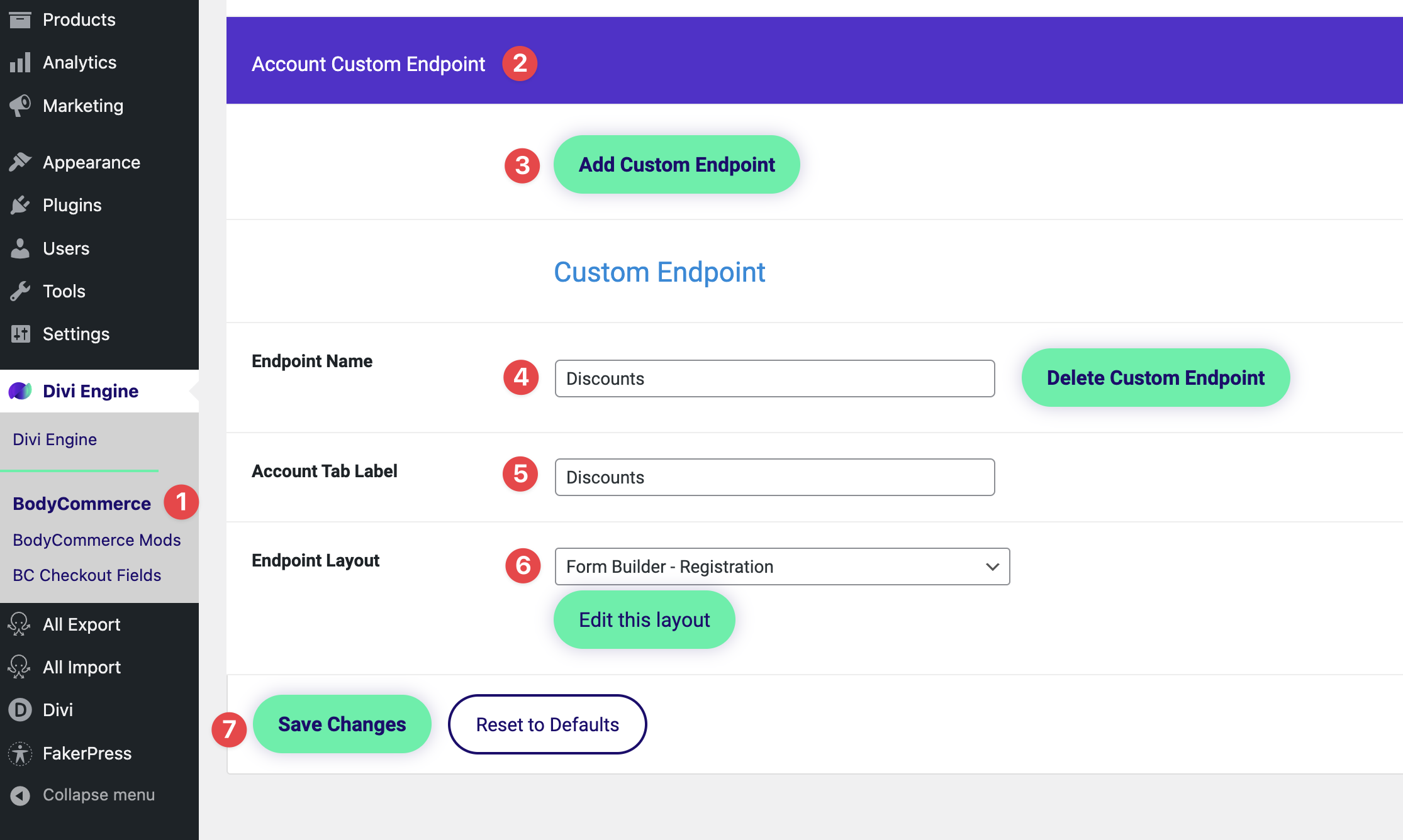 - Navigate to Divi Engine ⮕ BodyCommerce ⮕ Account Pages