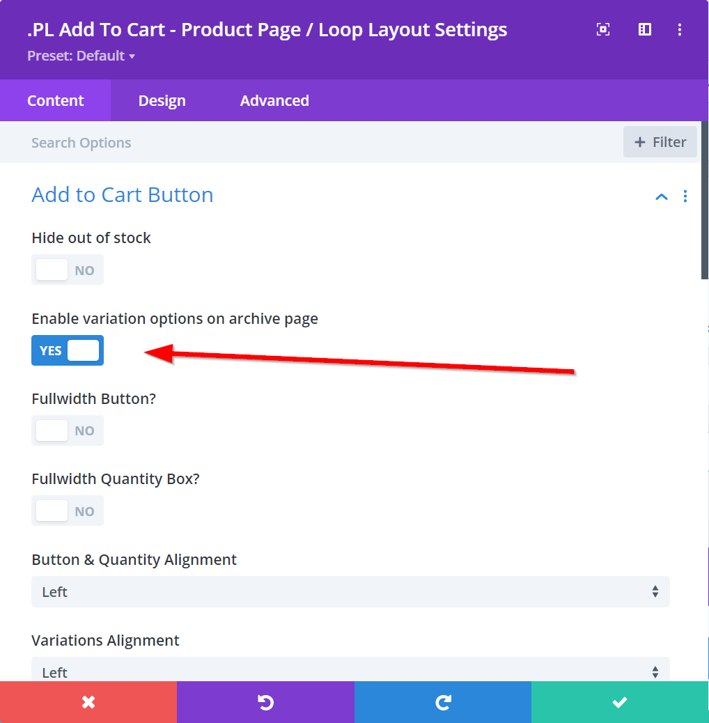 Add the "Add to cart" module to this custom loop layout and then enable the setting: Enable variation options on the archive page (see below)