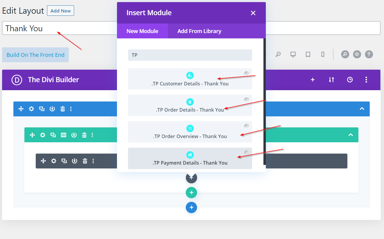 Make your way to the Divi Library and create a new layout. Note that you can only use the thank you page modules for this page. For more information on the modules to add to the Thank You page, visit the "Thank You Page" section of our documentation found on the menu to your left.