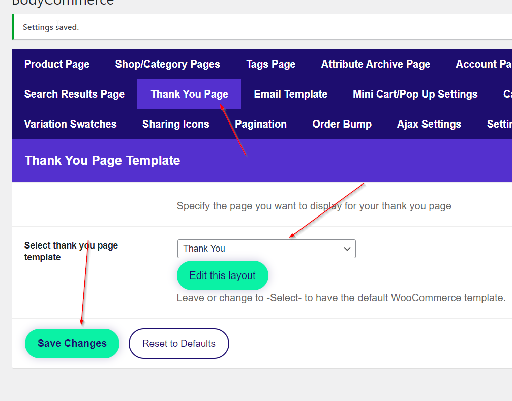 Go to Divi Engine > BodyCommerce > Thank You page and assign your template.
