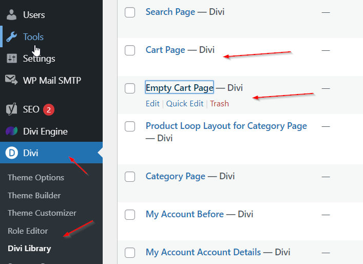 Go to Divi Engine > BodyCommerce > Cart Page and select your two layouts. To view your cart page view the /cart/ URL extension.