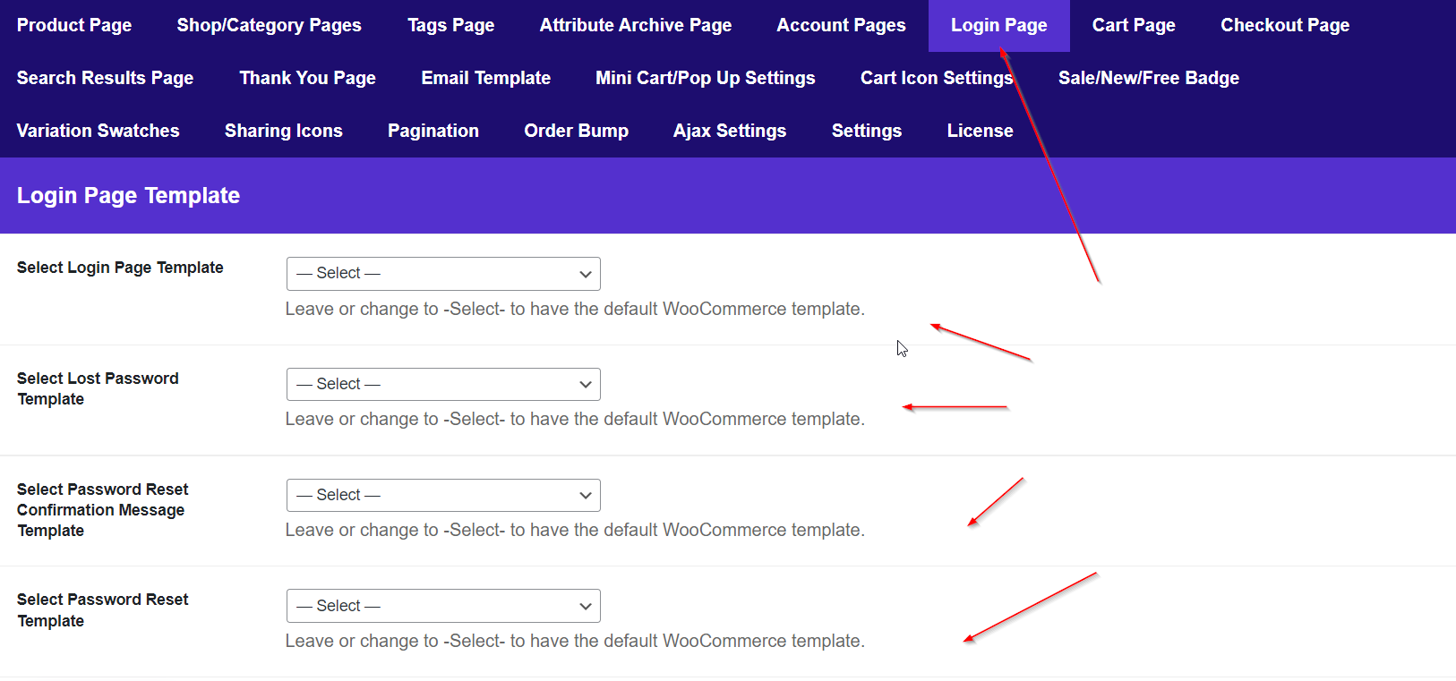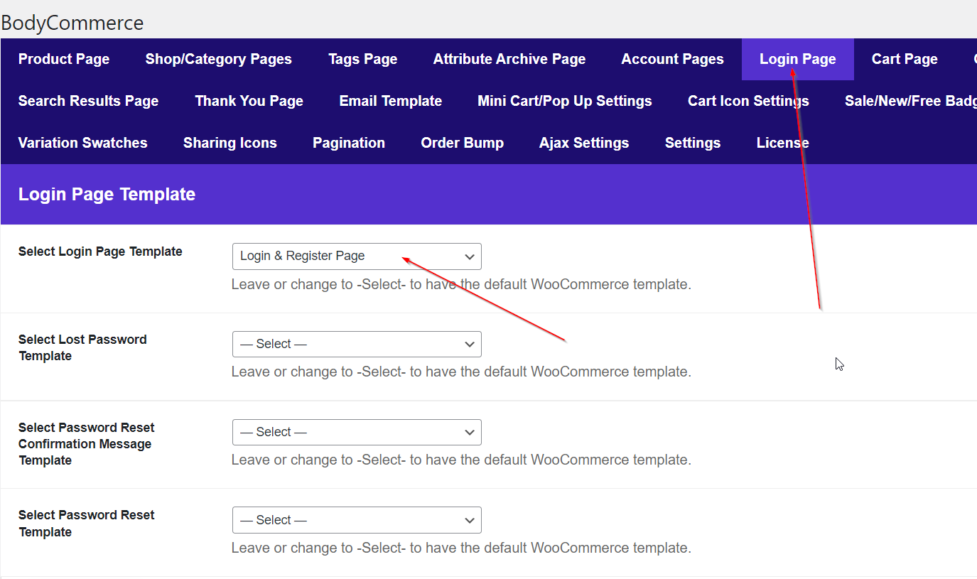 If you would like to use the default WooCommerce login and registration page then leave all the options in the Login Page of BodyCommerce blank.