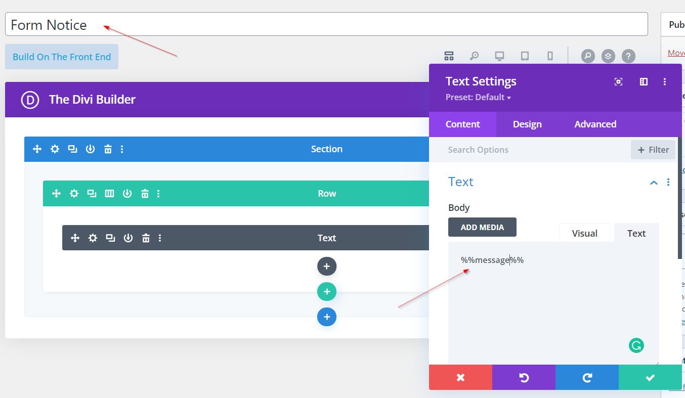 Make your way to Divi Library and create a layout containing a text module containing the characters %%message%%