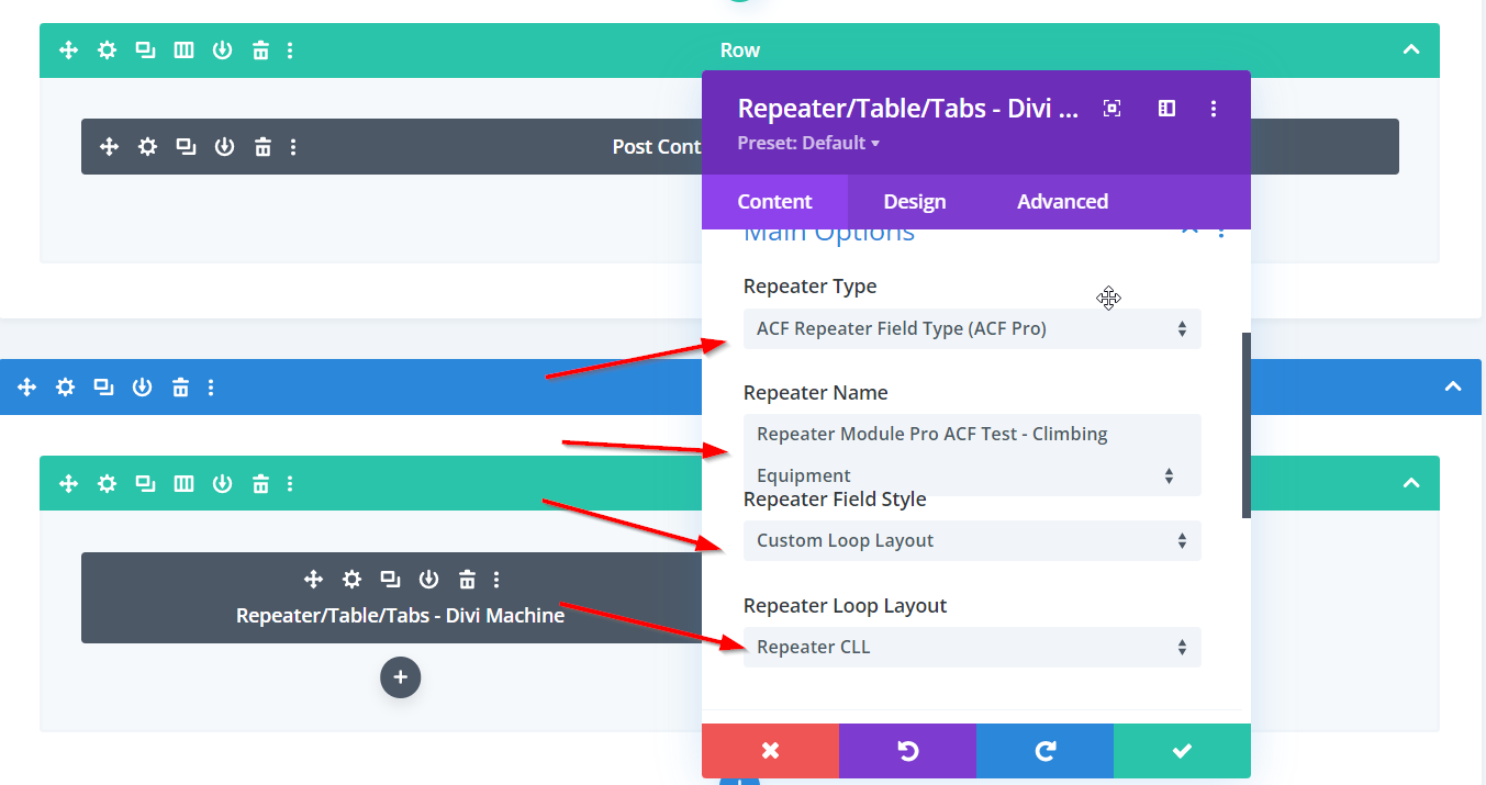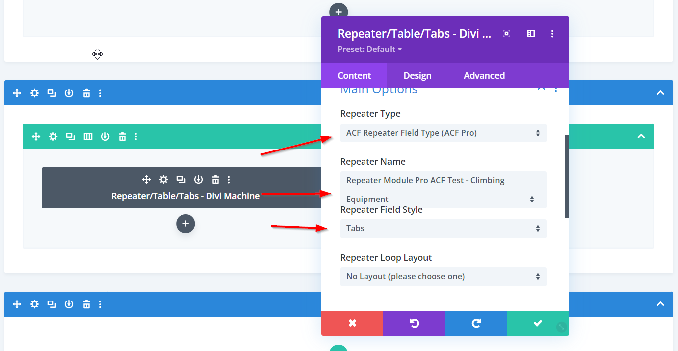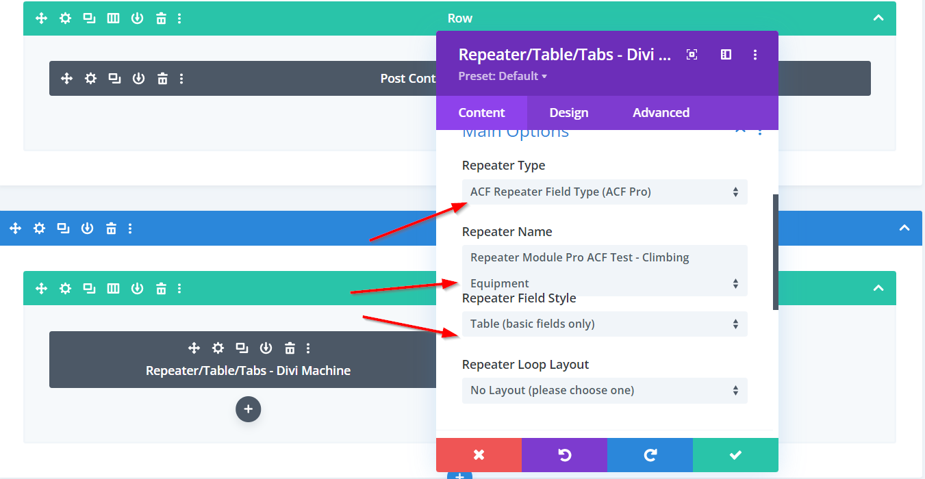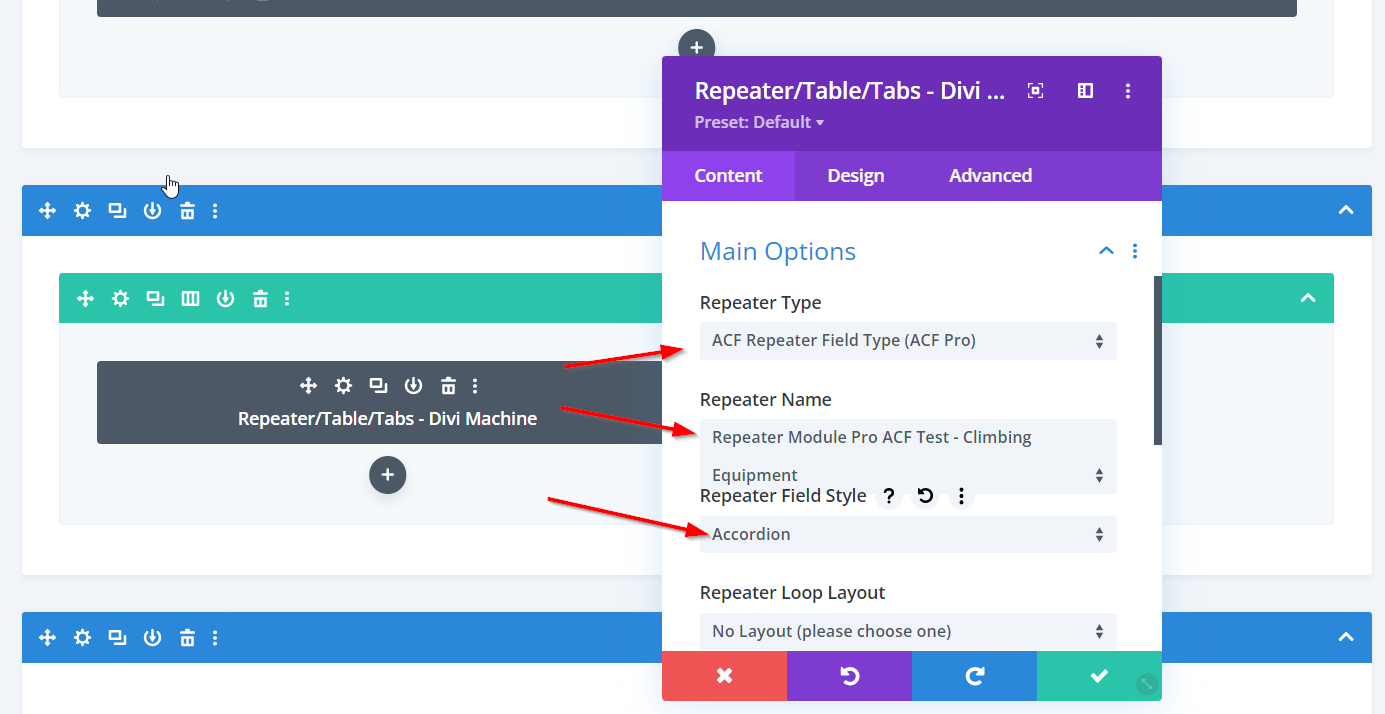 1.) Select ACF Pro from the Repeater Type field. 2.) Select the ACF Field of Repeater Type (not the individual Sub Fields). 3.) Select Custom Loop Layout from the Repeater Field Style. 4.) Create a Custom Loop Layout in the Divi Library adding ACF Item modules. Then in each ACF Item module, add the Sub Fields (one Sub Fields for each ACF Item module). Select this Custom Loop Layout