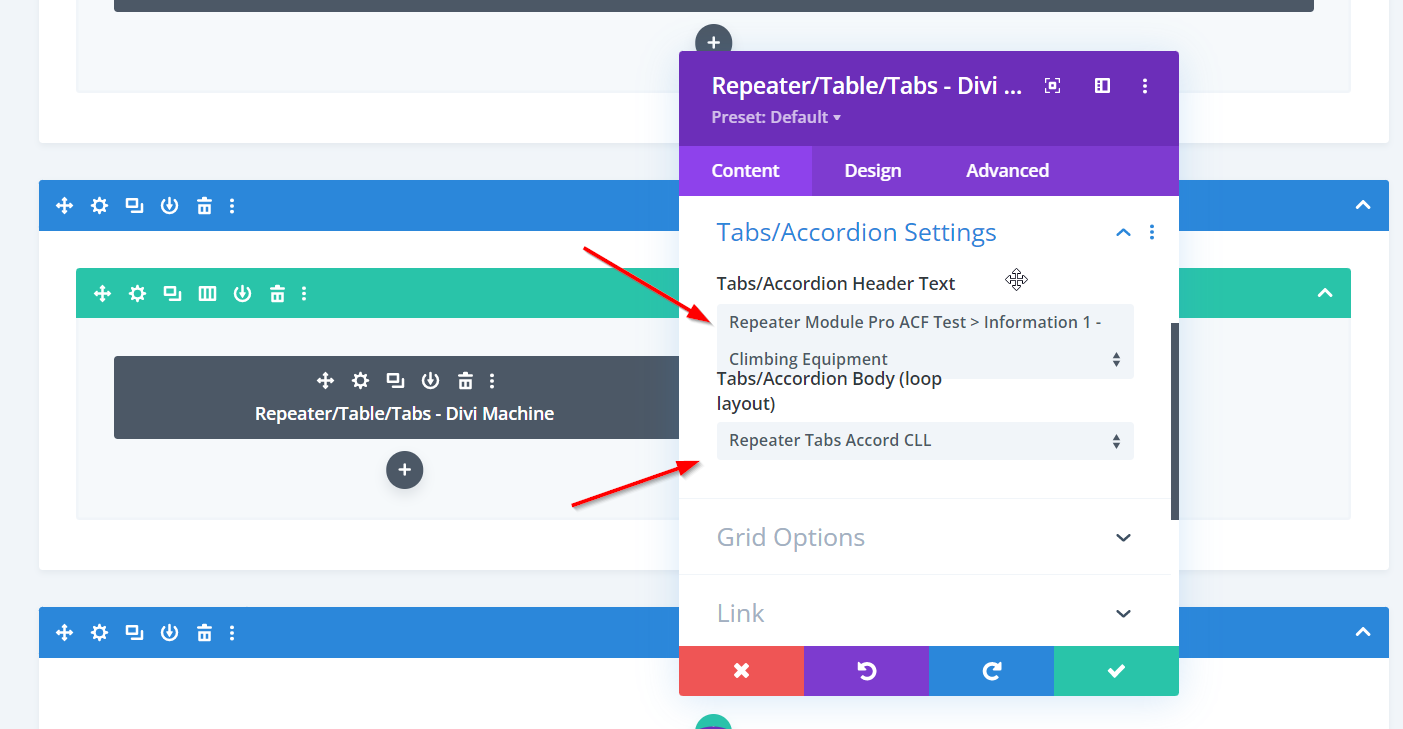 1.) Select ACF Pro from the Repeater Type field. 2.) Select the ACF Field of Repeater Type (not the individual Sub Fields). 3.) Select Tabs from the Repeater Field Style. 4.) In the Tabs/Accordion Settings select the first Sub Field of the ACF Repeater made above - this field will form the headings. 5.) Create a Custom Loop Layout in the Divi Library containing the ACF Item module. Assign the other Sub Fields (not the one used for the headings) to the ACF Item module - one Sub Field for each ACF Item module. Select this Custom Loop Layout