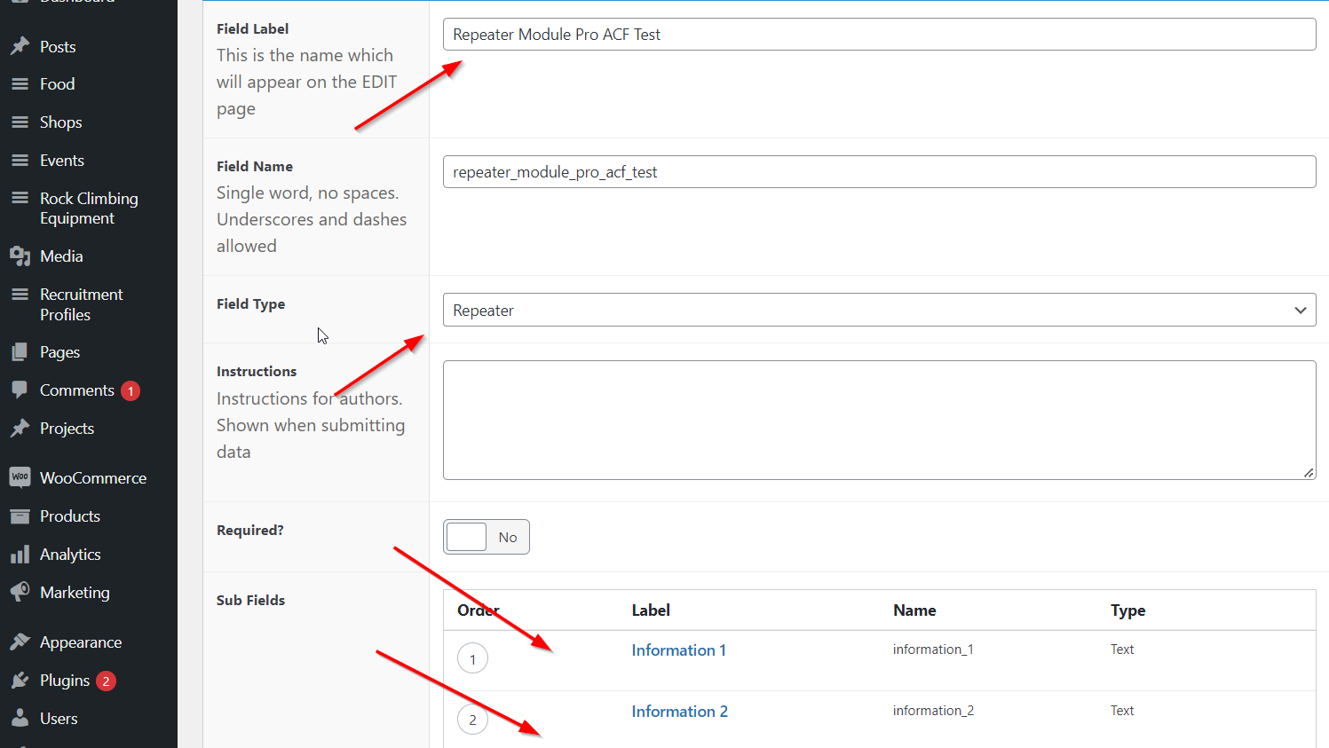 Start off by creating a custom field Repeater Type for your desired Field Group. In this example, I add a Repeater Type custom field called Repeater Module Pro ACF Test to a Field Group and then add two fields to the Sub Fields area.