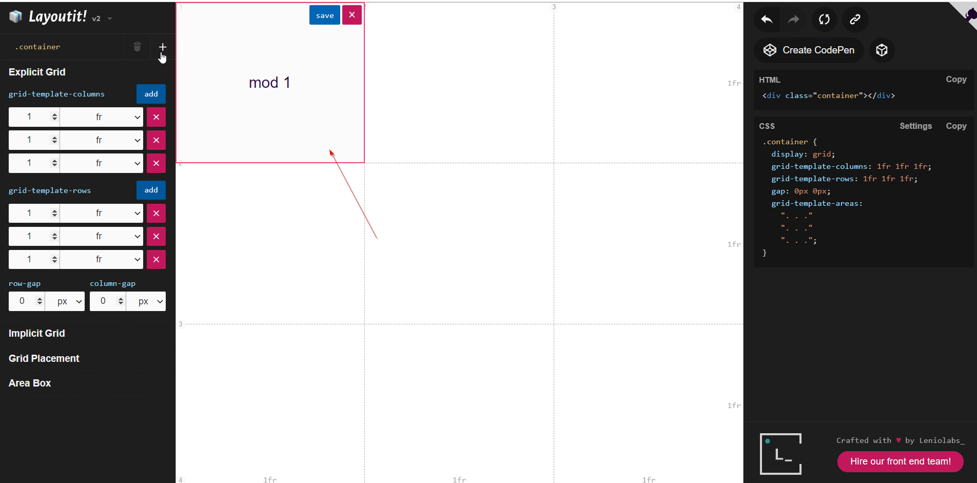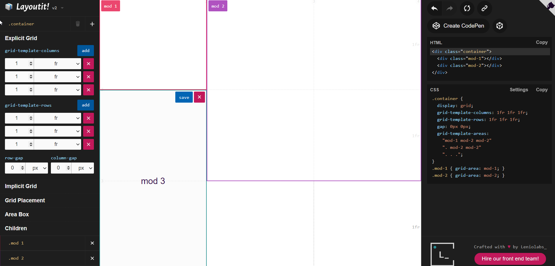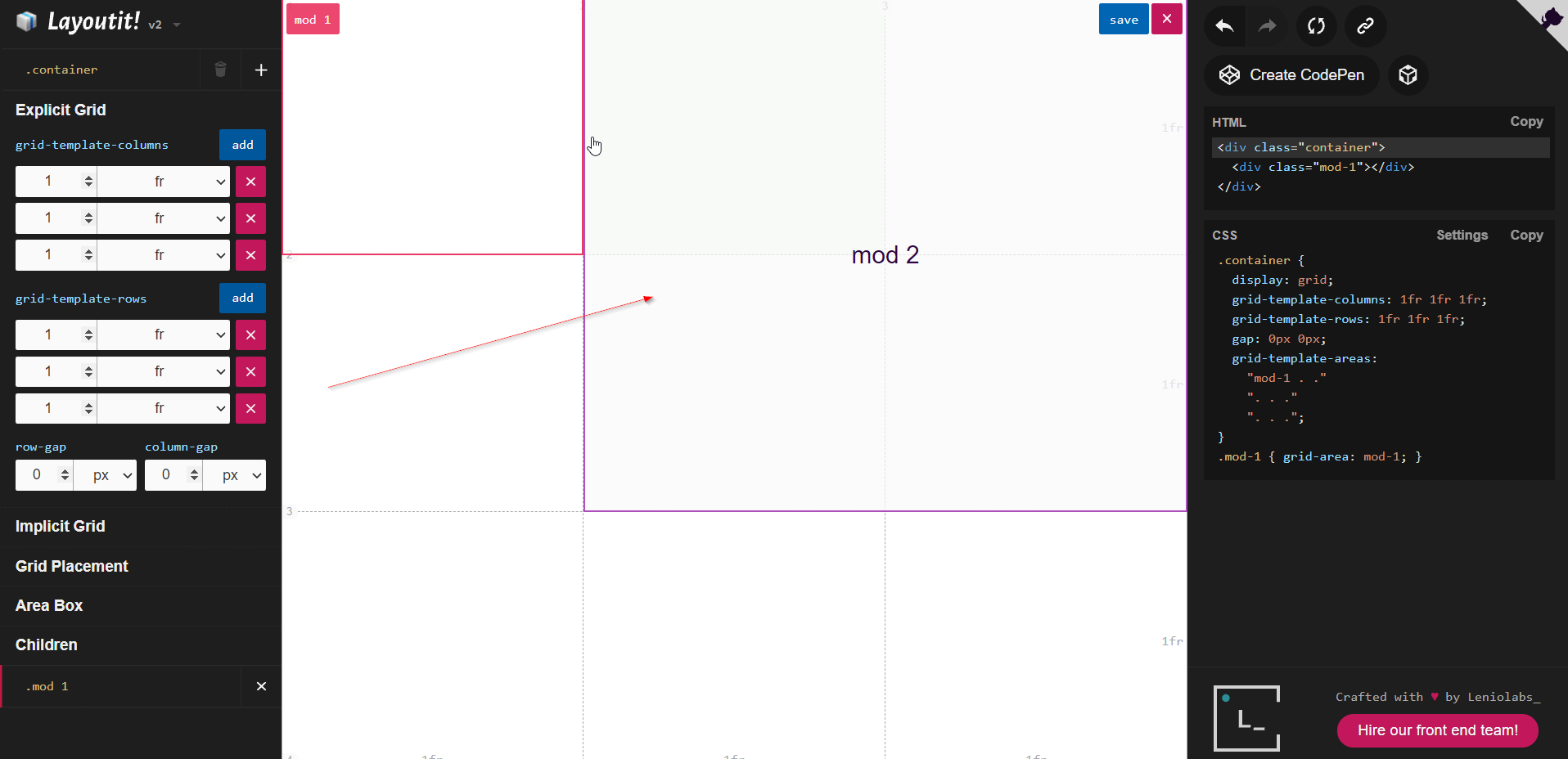 Click on a block again, but this time try to make it bigger like in the image below. Type "mod 2" and save the block. The second image will therefore take up four blocks of "mod 1" size.