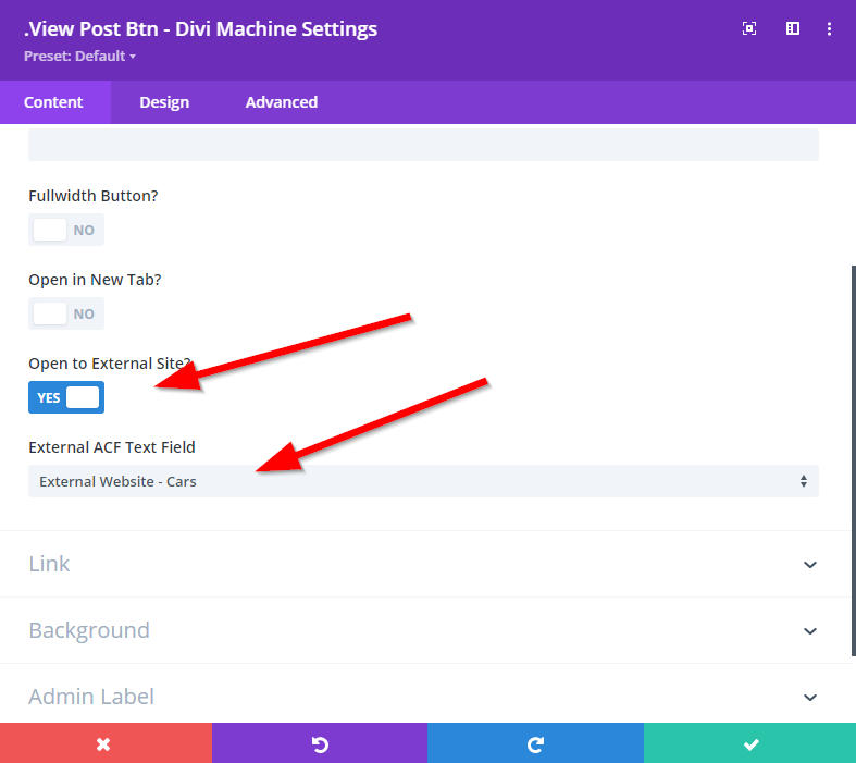 In the Custom Loop Layout add the View Post Button module, then enable Open to External Site and select the ACF field you created in step 1.