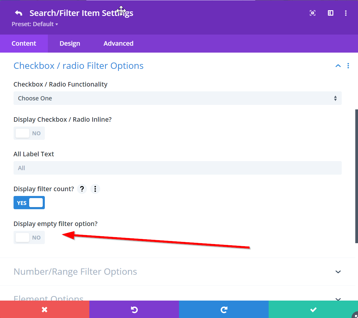 Enable or disable the feature called Display empty filter option. If you enable this button (Yes), then the empty ACF fields in your filter will show. However, if you disable (No) this feature then the empty ACF fields will not show.