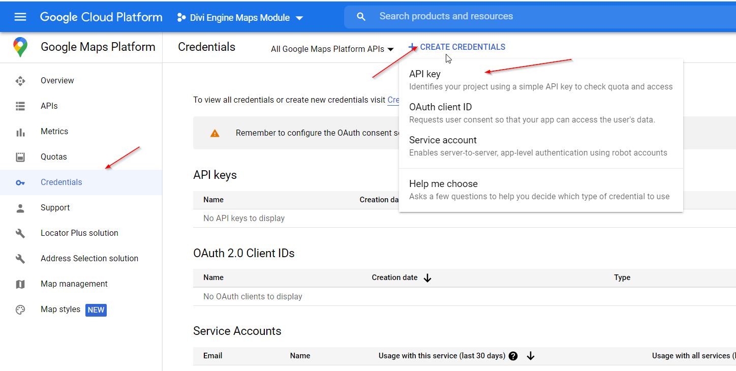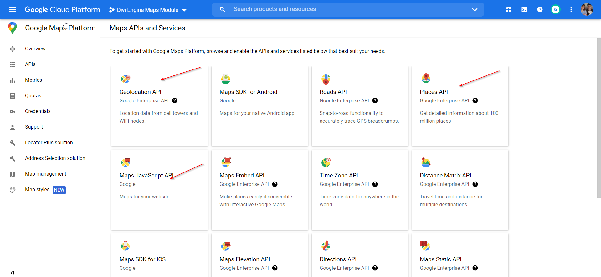 Go to Google Maps Platform and click on the credentials page. From there you will need to create a project and add the following APIs: Maps JavaScript API, Geocoding API and Places API. After this, you will be able to create an API key. Copy and paste this key into Divi > Theme Options > General.