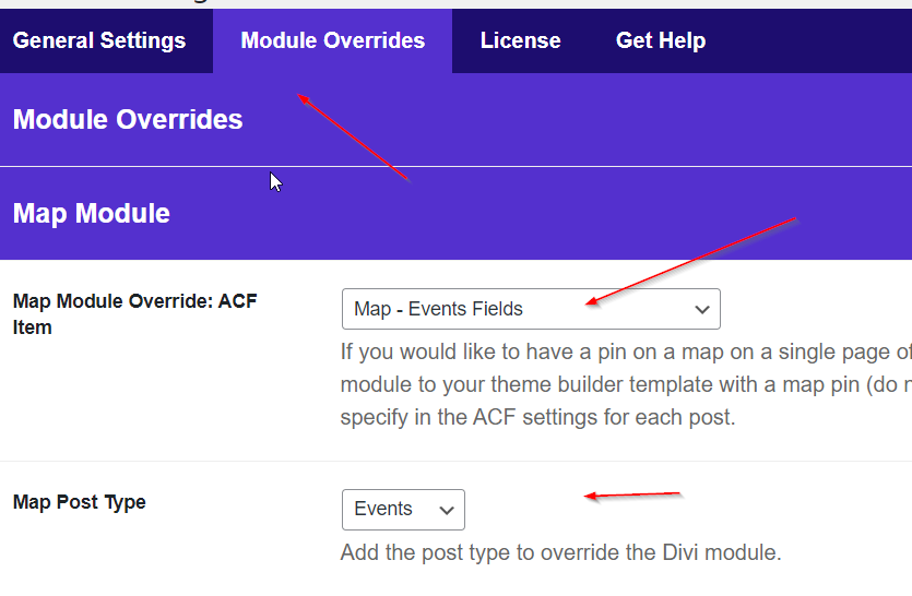 Go to Machine > Settings and override the Map Module by assigning your maps field and custom post type associated with the field.