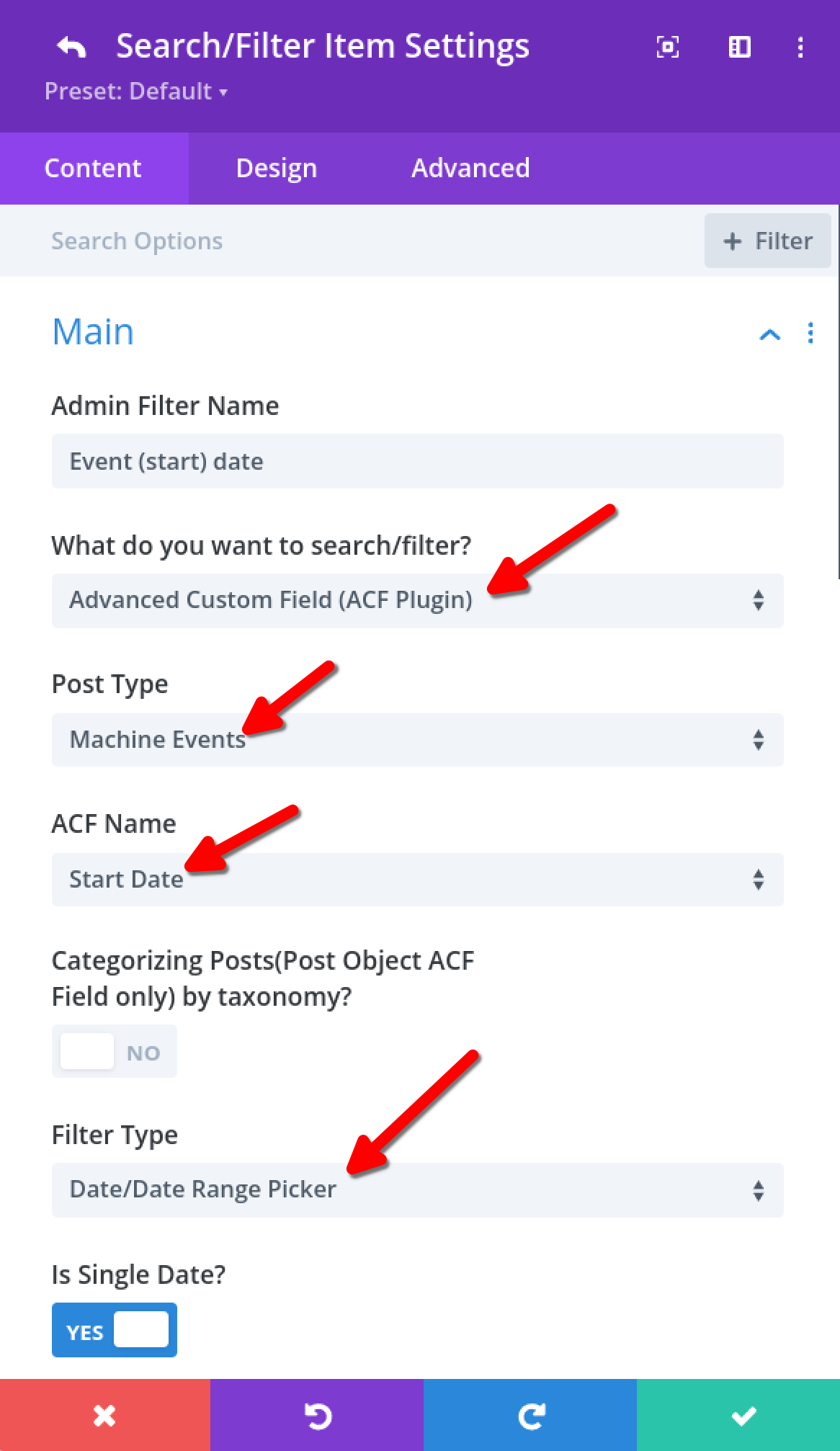 - ACF Name: Select the ACF field you wish to filter by, e.g., ```