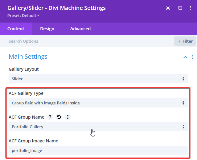 With Divi Machine, you can create ACF galleries without needing the Pro version of ACF. This workaround uses an ACF Group field to mimic a gallery structure and display it using Divi Machine’s Gallery/Slider module.