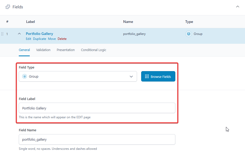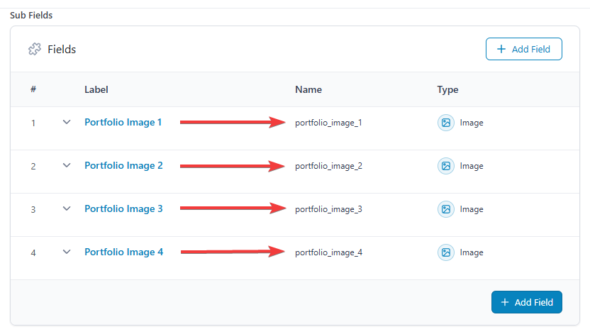 portfolio_gallery). - In ACF Group Image Name, enter the shared prefix of the image fields (e.g.