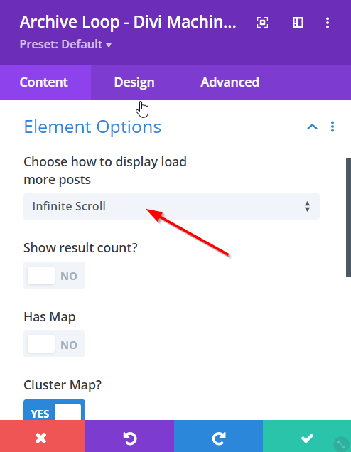 Scroll down to Element Options, select Infinite Scroll.