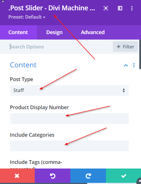 After adding the Post Slider Module you will need to customize it by defining the Post Type. Please view the Post Slider Module settings below.