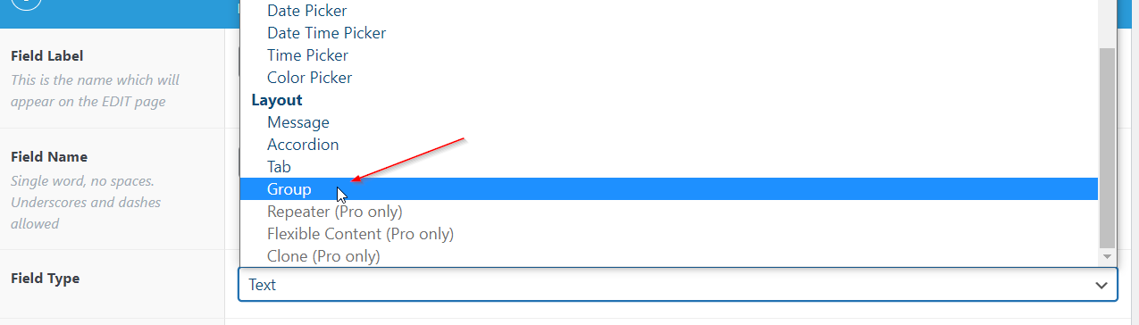 Click on Custom Fields and Add New Field Group. A field group is a collection of custom fields.