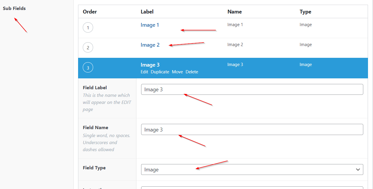 The free version of ACF does not allow for the image gallery field type and so we have built a way around it. To add an image gallery as a field select the Group Field Type and then add as many subfields as you want images. As you can see in the image below I have added 3 subfields, one for each image of the image gallery. Each image has a Field Label, Field Name and Field Type of Image. Make sure that each of your subfields have the names Image 1, Image 2, etc. and that the Field Type is Image.